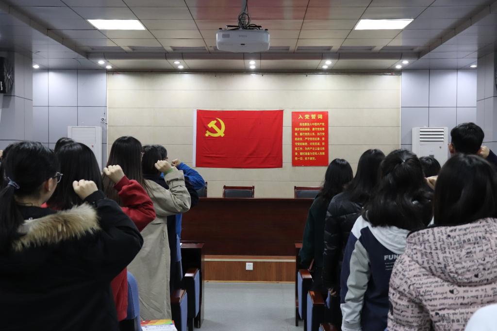 下午四点十分,党课正式开始。首先,在党员陈子璇的领誓下重温入党誓词。全体党员面对党旗,举起右手,握拳过肩,大声宣誓,一字一句,表达的是他们对党的赤诚忠心和“为党和人民牺牲一切”的庄严承诺。宣誓完毕后,党员何旭东回忆了自己入党宣誓时的心情。他说,“庄严的誓词令我心情激动,我立志要更加努力学习、积极工作、全面发展,将来为国家、为人民做出自己的贡献。”