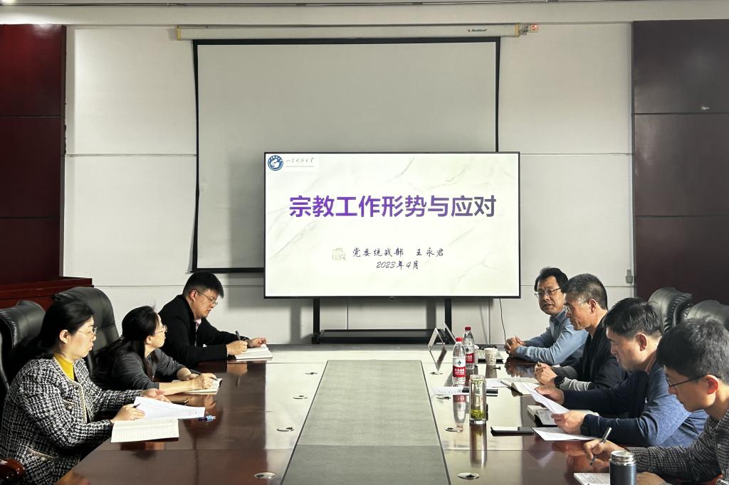 4月18日,MILE米乐集团党委理论学习中心组(扩大)开展2023年第六次集体学习,学校党委统战部常务副部长、台港澳工作办公室主任王永君应邀作《宗教工作形势与应对》专题报告。会议由学院党委书记宋西路主持。学院党委理论学习中心组、全体党支部书记、教工党支部支委委员、系所中心主任、科室负责人参加了会议。