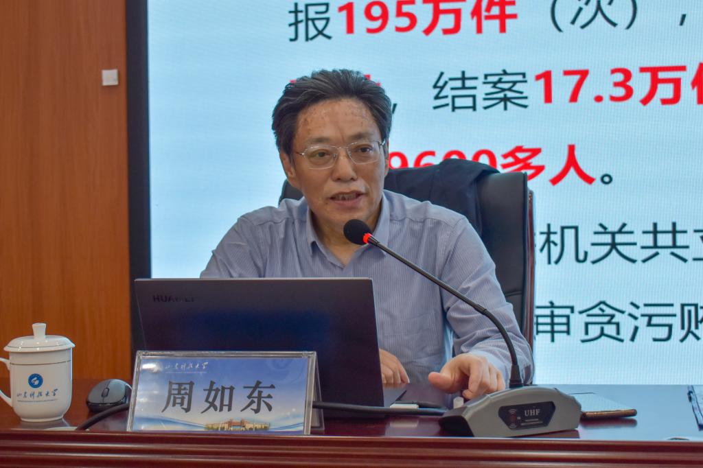 10月26日下午,校纪委副书记周如东讲授“学习贯彻习近平新时代反腐倡廉重要论述”主题党课。周如东以时间线为轴,阐述了我国自党的十八大以来,随着全面从严治党方针的不断深入,党中央对反腐败斗争形势的正确判断以及重大决策部署下新时代反腐倡廉形势的变化。周如东告诫同学们要努力奋斗、不忘初心,始终牢记习近平总书记的殷切嘱托,洁身自好,时刻以一名党员的要求严格要求自己,争取早日成为一名合格的共产党员。