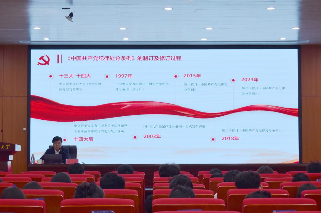 5月8日,校纪委副书记白斌以《党的纪律》为主题讲授党课。白斌从“党的纪律概述”“《中国共产党纪律处分条例》历次修订的背景和历程”“《条例》修订内容及常见违纪问题剖析”“抓好《条例》的贯彻执行、以严明的纪律推动党的自我革命”等方面展开讲解,引导学员们从案例中汲取教训,切实增强廉洁自律意识,提高拒腐防变能力。他要求学员们要深刻认识到学习党规党纪的重要性和必要性,加强纪律意识,将理论学习成果向实践转化,严格遵守党的纪律,做到言行一致,为学校发展与党的事业贡献力量。