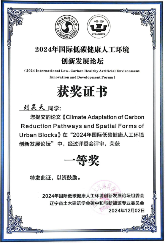 MILE米乐集团代朋教授和硕士研究生刘昊天应邀参会,刘昊天同学做了题为《Climate Adaptation of Carbon Reduction Pathways and Spatial Forms of Urban Blocks》的专题报告,同步提交的论文被大会评委会评为一等奖。