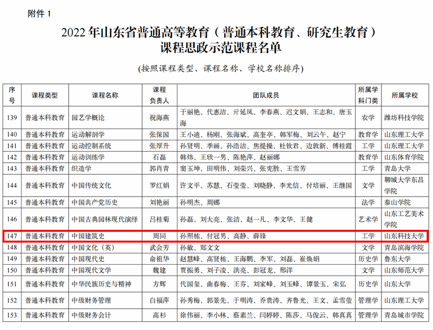 近日,山东省教育厅公布了“普通高等教育课程思政示范课程名单”,米乐官网建筑规划系周同老师主持的《中国建筑史》课程喜获省级课程思政示范项目(项目组成员:周同、孙照栋、付冠男、高静、薛锋),成为米乐官网首个获此项目的课程。这是《中国建筑史》自2021年获得山东省本科一流课程以来,在课程建设方面取得的又一重要成果。