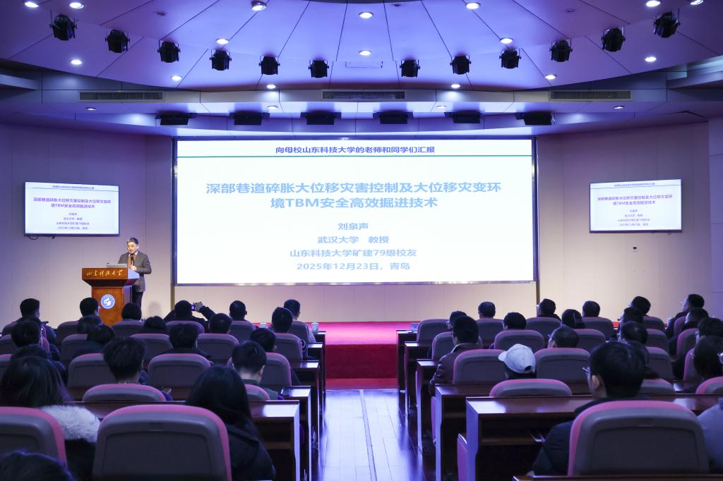 报告会上,刘泉声院士分享了他在深部巷道围岩稳定性控制领域深耕数十年的成果与体会,系统阐述了深部煤炭资源开发战略需求和深部巷道大变形灾害防控难题,详细介绍了巷道米级大变形灾变过程监测模拟技术和碎胀运动机理、分步联合控制理论及成套技术、TBM安全高效成巷关键技术三方面的研究成果及工程应用,整场报告内容翔实、思想深刻,引发在场师生的强烈共鸣。