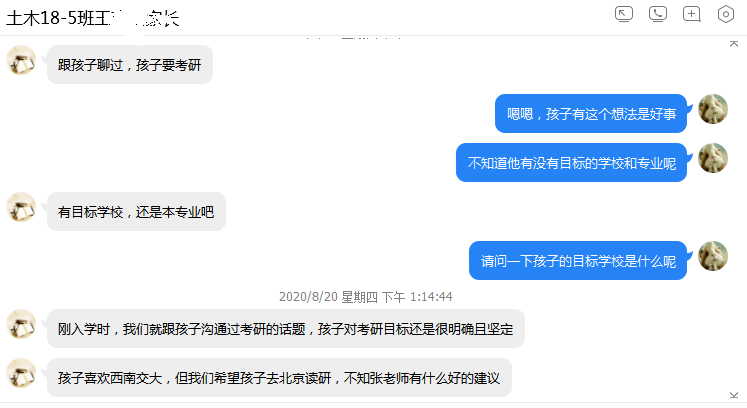 8月份,MILE米乐集团学生工作办公室各辅导员通过线上家长会、家长群、电话家访、微信一对一沟通等方式,根据学生具体情况和所处年级和时期,沟通了解学生在家期间的学习生活情况和生活动态,反馈学生在校期间表现,询问家长对学生的培养理念和期望,并给予建议。辅导员鲍娜娜在城乡规划和建筑学专业线上家长会上,向家长们介绍了2015级毕业班的就业与考研情况,并针对考研录取率背后折射出的原因和问题提醒家长们要根据学生实际学习状况规划合理目标、做出最佳选择。