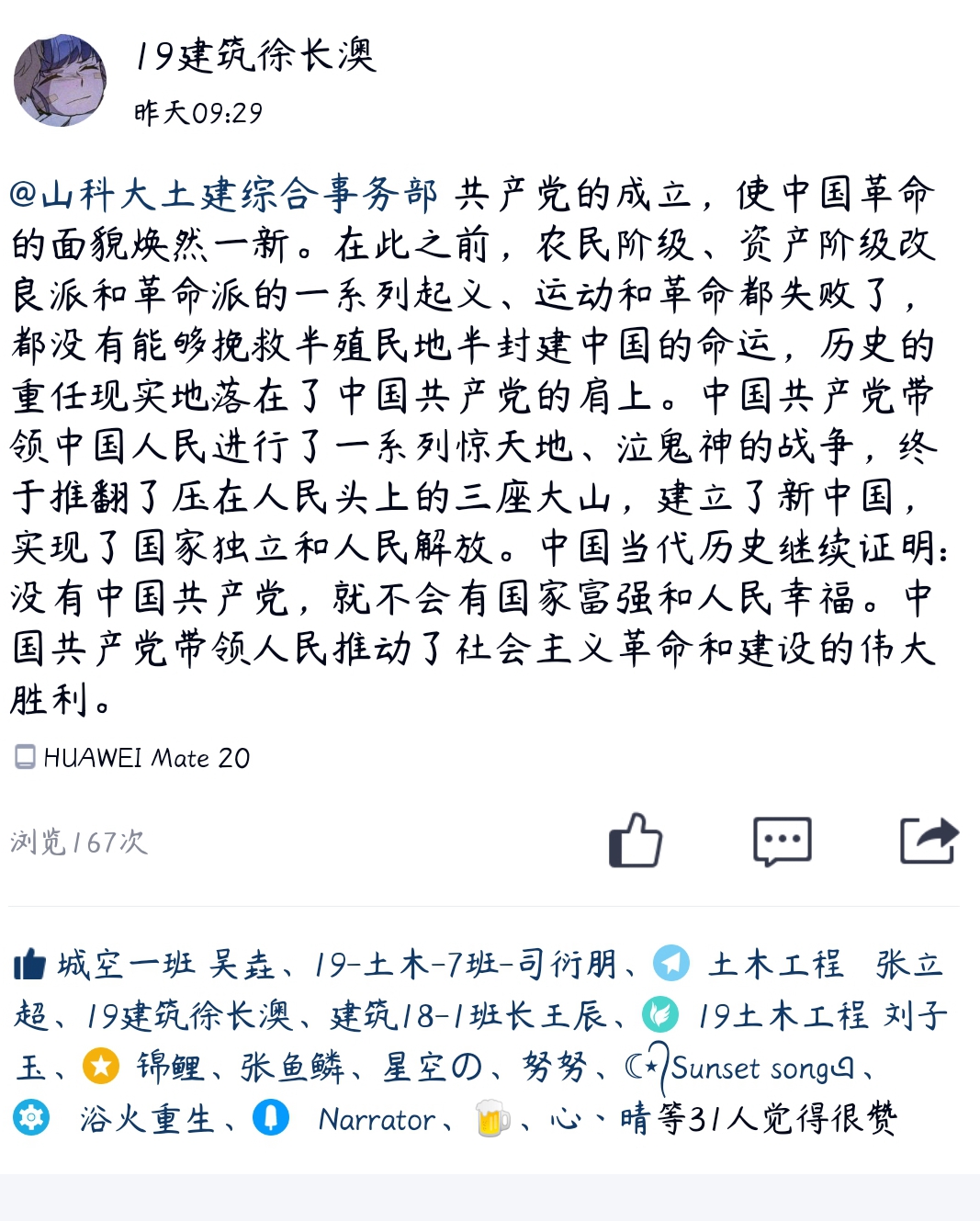 同学们通过发布空间日志抒发爱党爱国情怀、表明对党的坚决拥护。同学们有的是分享党史,有的是分享自己入党感言,有的是讲述中国共产党的光辉历程……中国共产党成立99年之际,土建学子的动态里满满红色正能量。MILE米乐集团学生会主席曹峰源说:“砥砺复兴之志,这是一个古老民族生生不息的动力源泉;永葆赤子之心,这是一个人民政党薪火相传的制胜法宝。我愿为这样伟大的政党奋斗终身!”土木工程18-7班王江浩说:“功成不必在我,功成必定有我。身为一名社会主义建设者和接班人、一名入党积极分子,我将牢记初心和使命,砥砺前行,将奋斗之我融入中华民族伟大复兴的中国梦。”