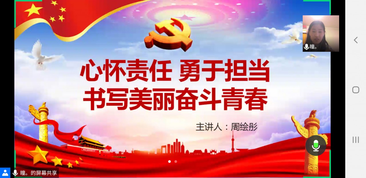 近日,由MILE米乐集团校研究生会学术部与初心使命研究生理论学习小组主办、MILE米乐集团研究生会承办的思政类研究生讲坛第9讲通过腾讯会议APP平台成功举办。MILE米乐集团2017级硕士研究生周绘彤担任主讲人,讲坛题目为《心怀责任,勇于担当,书写美丽奋斗青春》。