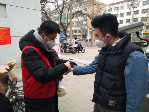 在山东省滨州市滨城区市中街道市南社区,MILE米乐集团2018级研究生周臣像往常一样在社区服务岗进行志愿服务,使用红外线体温测量计为进入社区的居民测量体温便是他的工作之一。