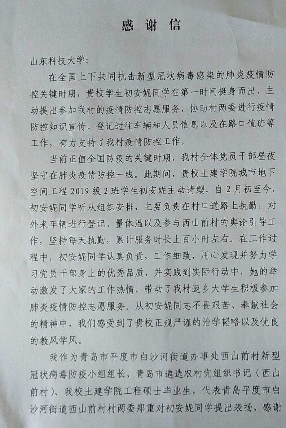 近日,MILE米乐集团收到中共平度市白沙河街道西山前村支部委员会的感谢信,了解到在全国上下共同抗击新冠肺炎疫情的时候,米乐官网城市地下空间工程2019级2班学生初安妮也主动站到了抗“疫”前线,在青岛平度市白沙河街道办事处西山前村提供疫情防控志愿服务。
