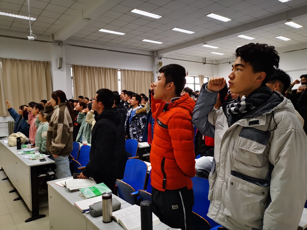 宣誓活动开始时,主讲人先带领同学们学习了宪法发展史,借助宪法条文的解读,让同学们更加深入了解宪法。随后主讲人带领同学们进行宪法诵读与宣誓,同学们统一集体起立,面向前方,大声而整齐地朗诵了宪法的部分内容,句句铿锵,句句有力。朗读完毕后,再由领誓人发起领读誓言,带领同学们一起举起右拳,庄严地宣誓。
