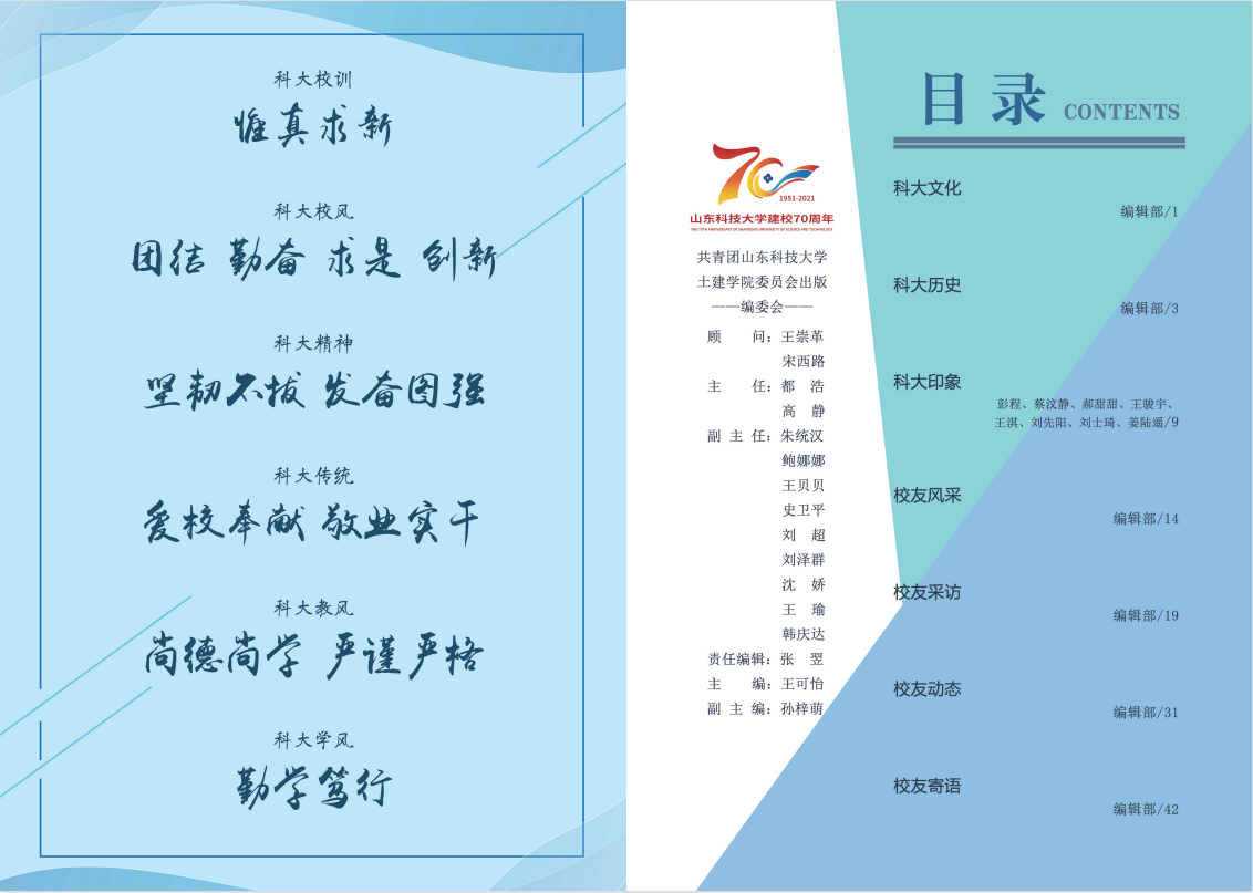 《建设者》校庆特刊由MILE米乐集团党委指导,学院新闻宣传中心编撰,包含“科大文化”“科大历史”“科大印象”“校友风采”“校友采访”“校友动态”“校友寄语”等七个板块,从不同视角呈现了科大之底蕴、土建之传承,帮助更多校友了解科大发展脉络、土建成长历程。本次校庆专刊特邀泰安、济南、济宁等校友会,以及多位优秀校友为山科送上生日祝福,充分展示了学院校友工作的成果和对科大真诚的祝愿。