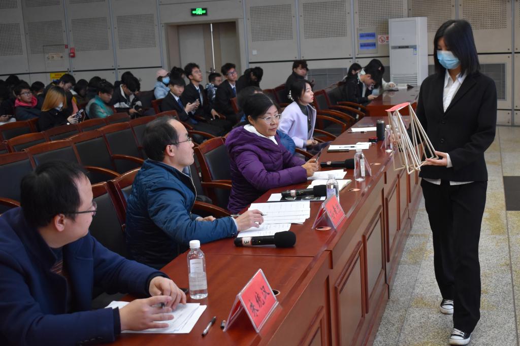 随后,比赛正式拉开帷幕,进入决赛的15组选手分别进行了作品展示和加载测试。第一轮进行的是A组的创模模型展示,该组以“基于立方体的光影探索”为设计命题,选手们用精巧的结构设计,独特的创意思维,为我们展现出光这一自然因素带给我们的视觉冲击和感官体验。之后,进行了B组结构模型的展示及加载,该组以“棱台构造”为设计命题,工作人员在现场对模型的承重部位分别进行了竖向静载和竖向冲击荷载的测试。评委老师对各组的模型进行提问并提出了优化方案。