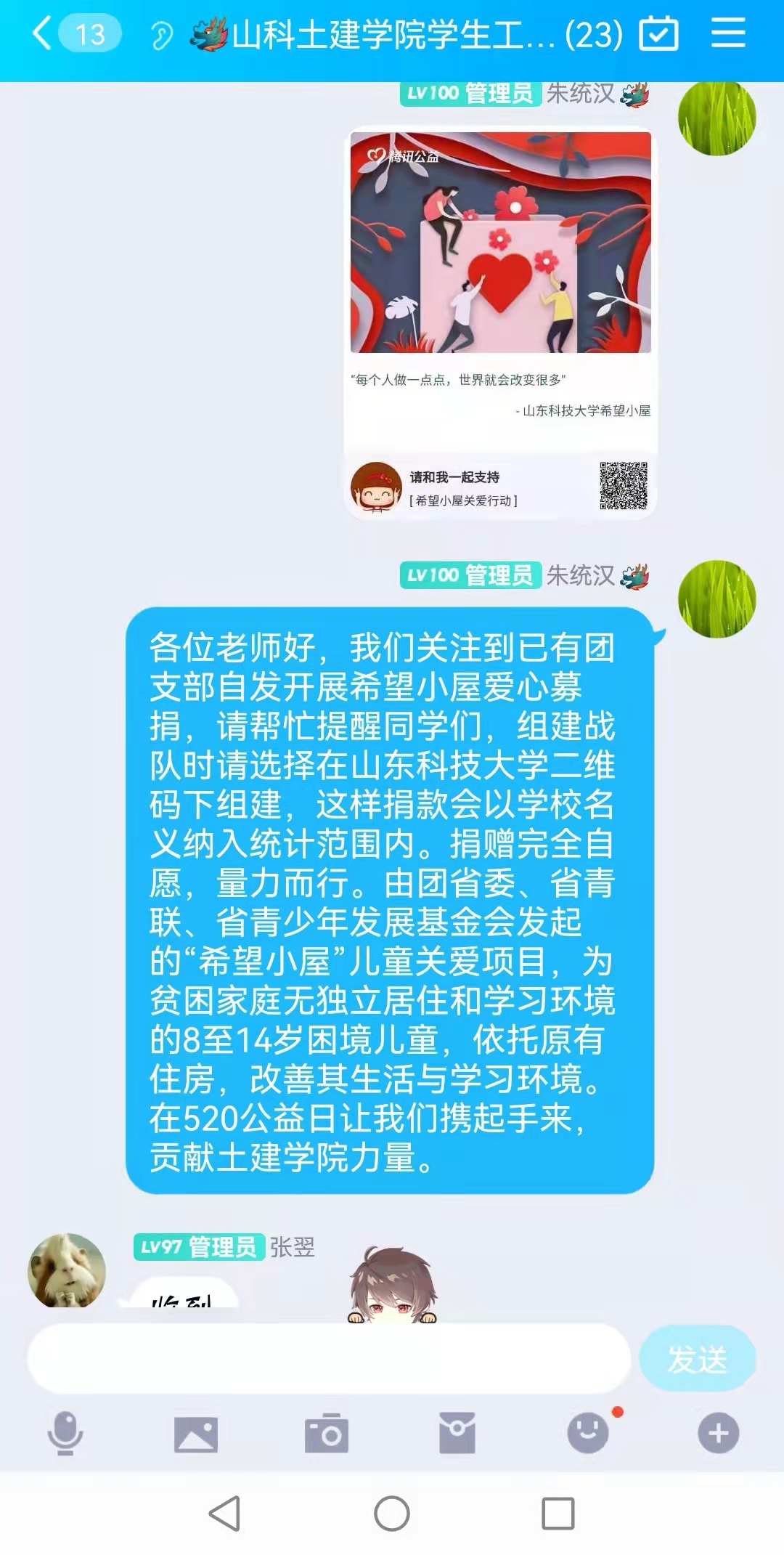 学院稳步推进募捐活动,老师们于QQ群、朋友圈和QQ空间等社交平台进行宣传。涓涓细流汇成大海,点点星光照亮苍穹。经过不懈努力,此次公益募捐活动得到广泛关注,于520当日掀起一股同献爱心、共助公益的募捐热潮。