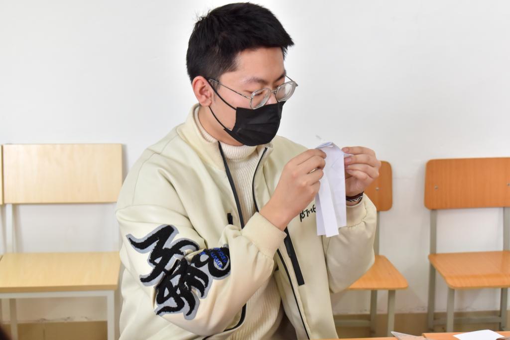 活动邀请了“折纸少年”孙洪涛带领同学们折“抗疫‘大白’”。活动伊始,孙洪涛向大家介绍本次折纸活动的内容,并细心讲解了的制作要领。同学们各种折纸手法层出不穷,捡、挑、捏、压、翻、挤、拆、插,薄薄的纸片在他们手中舞出了生命,一个个可爱的“抗疫‘大白’”汇聚在一起,展现了医护人员和志愿者众志成城战胜疫情的信心和力量。