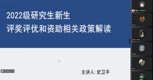 为帮助新生更好地了解研究生评奖评优和资助政策,加强对新生的励志教育与感恩教育。2022年9月8日晚,MILE米乐集团举行新生评奖评优和资助相关政策解读线上讲座。本次讲座由辅导员史卫平主讲,2022级全体新生线上参加讲座。