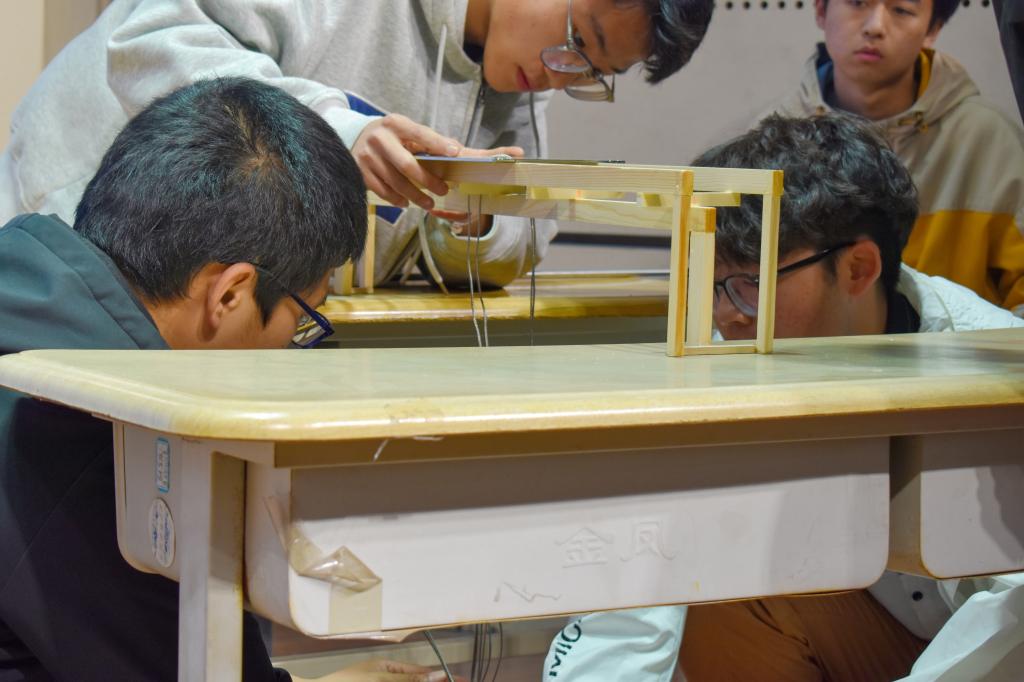 比赛要求采用胶水、木条为材料,搭建一座桥梁模型,以模型承受最大重量与美观度为胜负决定因素,参赛队伍通过PPT和模型展示等方式向赛事评委介绍自己的作品,讲述作品设计的合理性和设计理念。各位评委向各队提问并对各参赛队伍作品做出评价,提出改进建议。工作人员通过对各队伍的桥梁模型进行静力动力承重测试检验作品质量测试得出相应的参考数据。