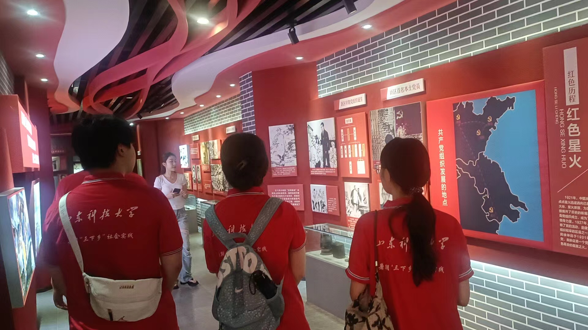 7月24日,团队成员来到青岛市杨家山里红色教育基地。“感受弦歌不辍的传承,激荡思接千载的心绪”,红色文化需要传承也必须传承,团队成员在参观时恰与假期研学的小学生相遇,看着他们认真聆听着讲解员讲述杨家山里人民在中国共产党的领导下,与日伪浴血奋战的故事。此刻展板上的那句“红色基因代代传承”成为现实。团队成员还和小朋友们一起瞻仰了革命先辈们抗日武装斗争的珍贵历史照片、实物,观看了杨家山里人民英勇抗争的历史影像和杨家山里乡村振兴的发展历程。展馆中,1937年至1945年间党在杨家山里斗争的点点滴滴被生动地展现出来,让每一位团队成员都深受感动。