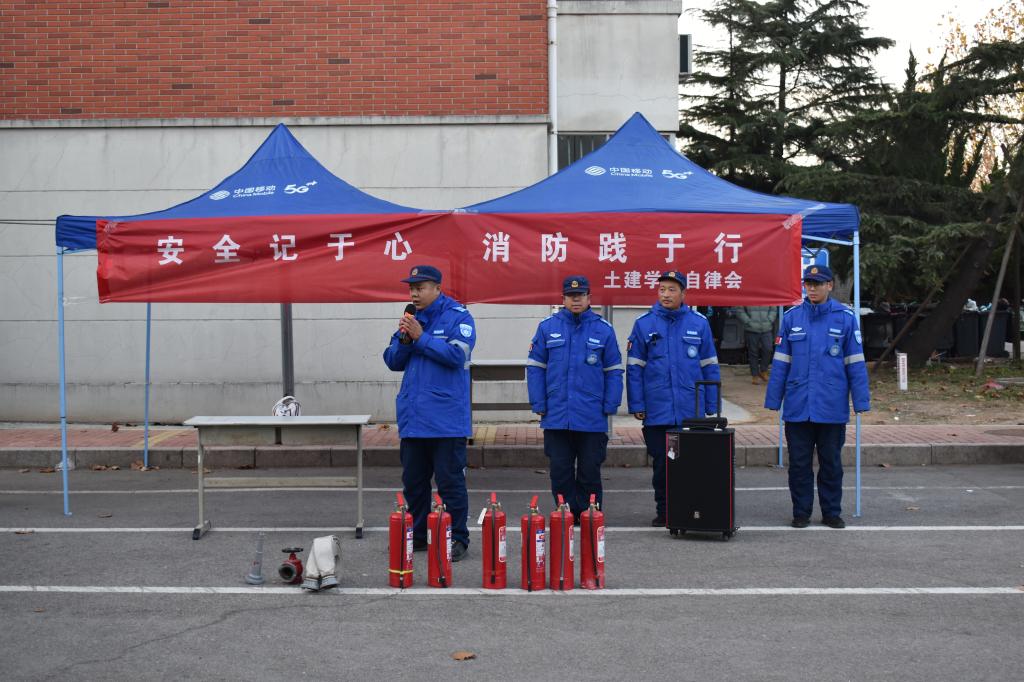 随后,在GB2宿舍楼前,由消防工作人员向大家讲解消防知识以及消防器械的使用方法,设立多处火点组织同学有序的参观消防器械的详细使用过程。