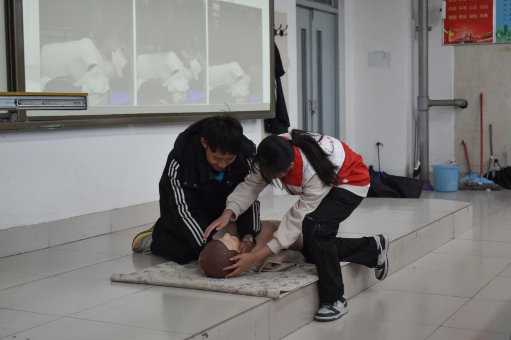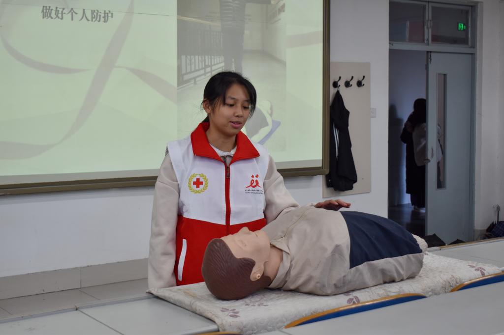 宣讲团的志愿者首先向同学们普及了血压测量的相关知识、包扎止血、常见意外应对措施以及心肺复苏四个方面的应急救护知识。在理论宣讲环节,志愿者详细讲解了各种应急救护知识的重要性和操作要点。例如,如何正确测量血压、如何在发生外伤时进行有效的包扎止血、如何应对常见的意外事故以及如何在紧急情况下进行心肺复苏、AED的基本使用方法等。此外,为了让同学们更好地掌握这些技能,活动还特别设置了练习环节。志愿者现场指导同学们根据步骤进行操作,确保每位参与者都能够亲自动手实践,巩固所讲知识。