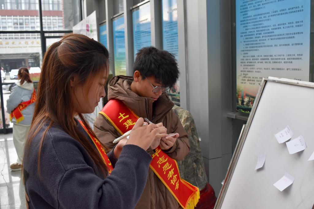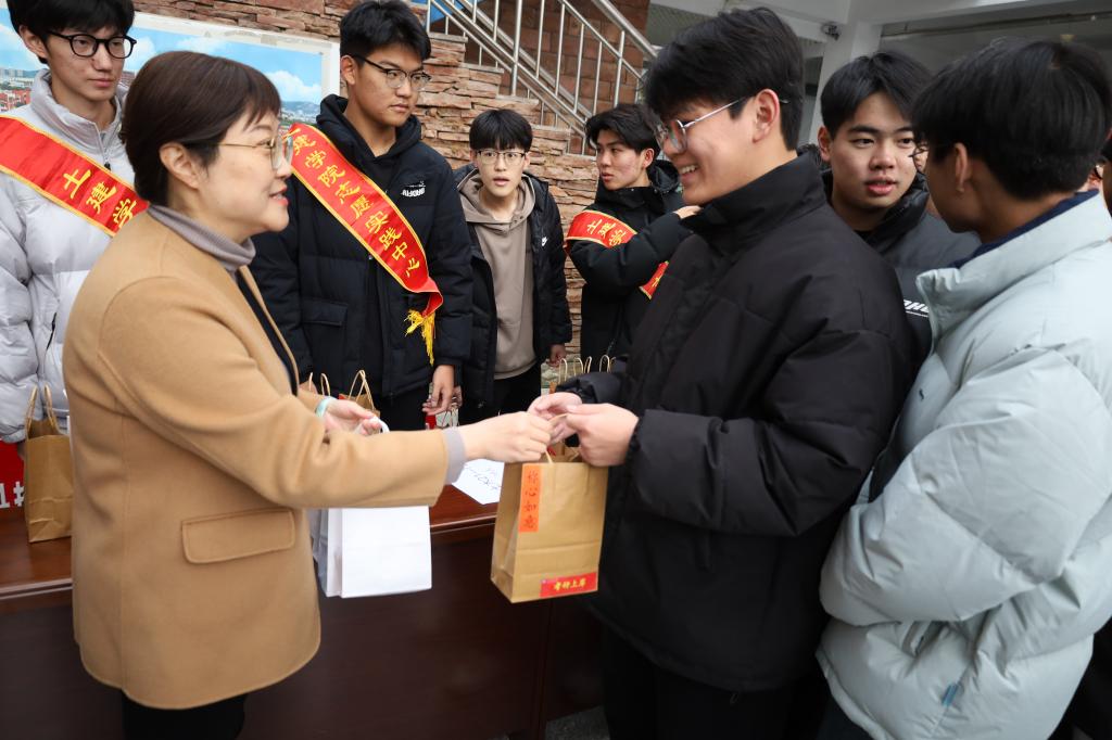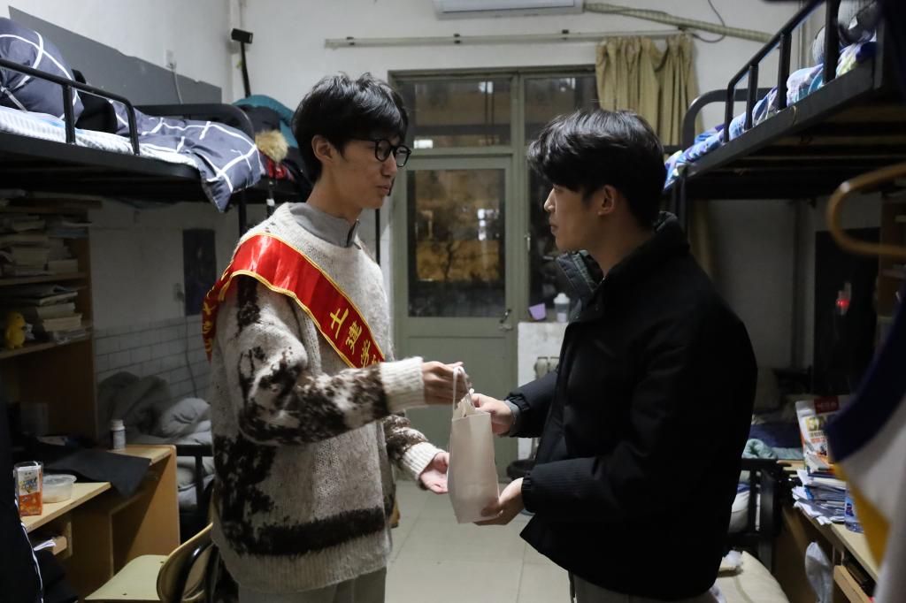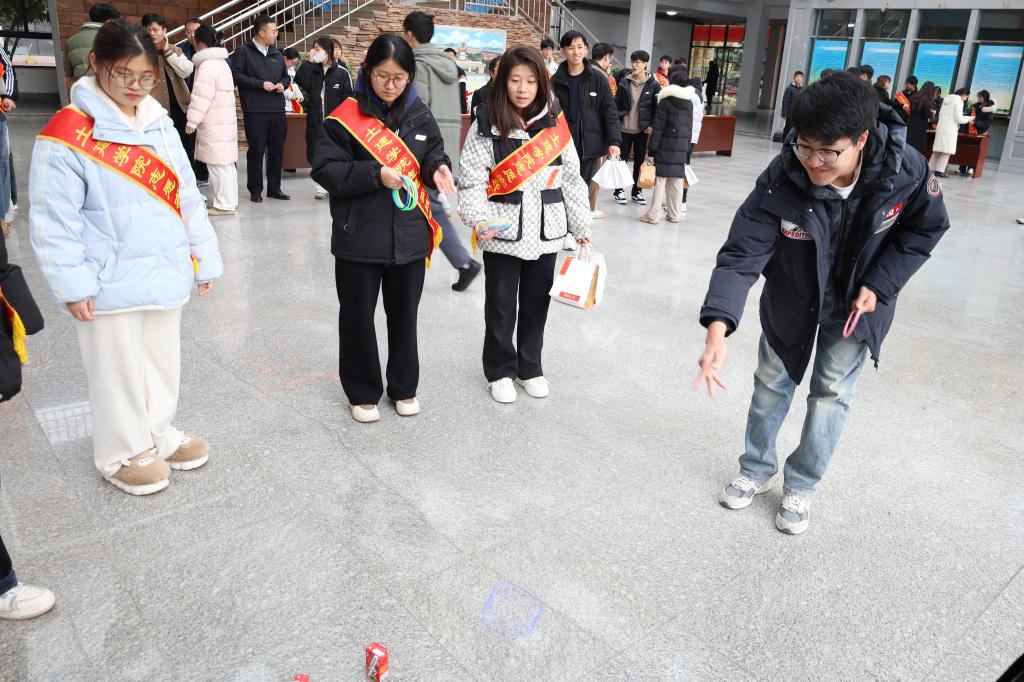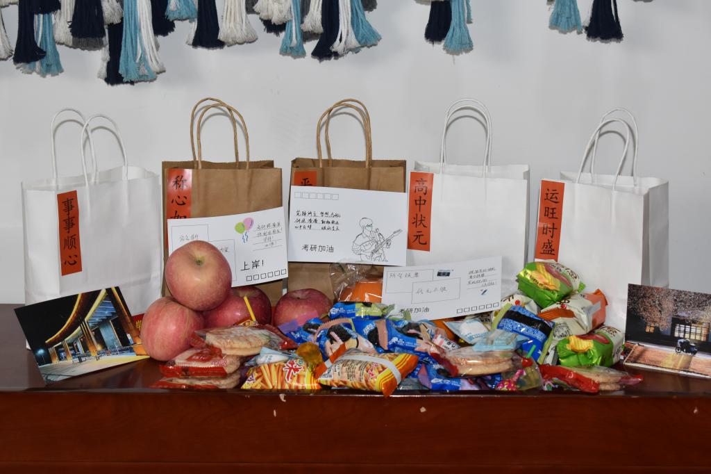 活动现场,志愿者们精心布置,为考研学子准备了丰富的礼品,包括平安喜乐的苹果、事事顺心的柿子、称心如意的的橙子、一举夺魁的橘子等礼品。宋西路、高静和团委辅导员老师们将“考研加油福袋”亲手送给现场每一位考研学子,贴心地询问复习进度和生活情况,并祝愿同学们考研顺利。此外,志愿者还深入考研学生宿舍,为未能到现场参加活动的考研学子送上“考研加油福袋”,确保每一位考研学子都能感受到来自学院和老师的关心与祝福。活动还设置了互动环节,通过套圈、小黏手游戏和写祝福语让考研学子们相互鼓励、交流心得。活动现场气氛热烈,笑声不断,让紧张备考的学子们暂时缓解了备考的压力。