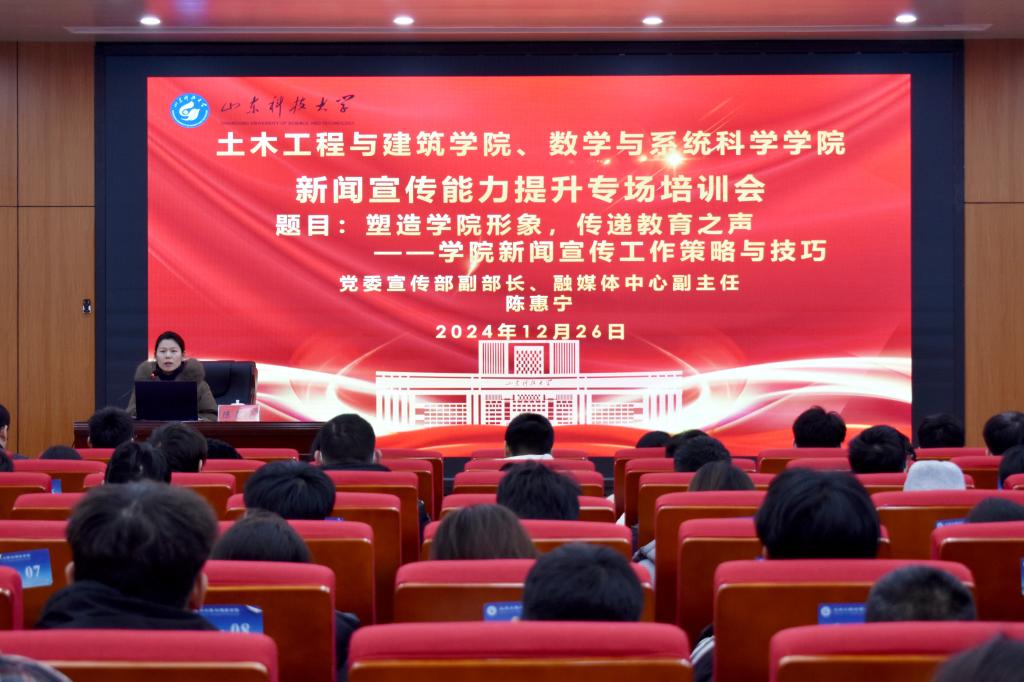 为进一步加强学院宣传队伍建设,提升新闻宣传工作水平,12月26日,MILE米乐集团与数学学院于J15-136报告厅联合举办了新闻宣传能力提升专场培训会,本次培训会邀请校党委宣传部副部长、融媒体中心副主任陈惠宁和《山东科大报》编辑、校党委宣传部韩洪烁老师分别作报告。学院新闻宣传中心成员及各班级宣传委员参加此次培训会,培训会由MILE米乐集团学生工作办公室主任、团委书记王贝贝主持。