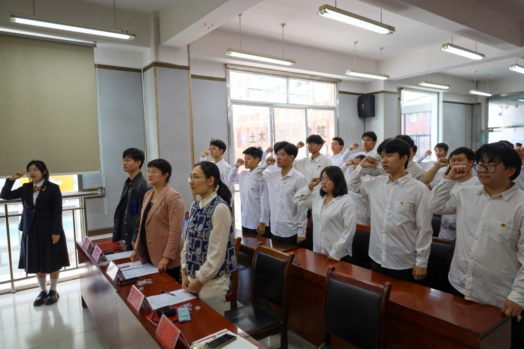 仪式在雄壮的《中华人民共和国国歌》声中拉开帷幕。张方源宣布新发展团员名单,高静、史卫平、董继先、赵珂为新发展团员代表佩戴团徽,熠熠生辉的团徽佩戴在胸前,象征着新团员们从此肩负起共青团员的光荣使命。