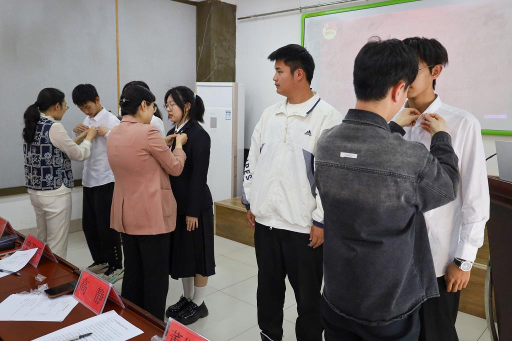 为新团员佩戴团徽