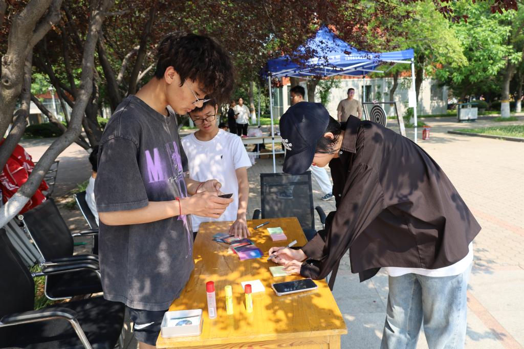5月24日,“心拥自我,煦暖而行”活动在繁星广场举行。活动展板前,负责人向大家系统科普了情绪ABC理论、呼吸放松法等实用技巧。“心愿漂流瓶”摊位前,匿名纸条在投递与抽取间传递着共鸣:有人写下“考研倒计时的焦虑”,收获“按部就班就是答案”的回复;有人分享“收到录取通知书的喜悦”。最热闹的“烦恼击倒挑战”中,同学们用软球投掷贴有“拖延”“内耗”等标签的塑料瓶,随着瓶子应声倒地,欢呼声与奖品兑换的笑声交织成轻松的节奏。志愿者们全程陪伴倾听,为需要倾诉的同学递上纸巾与暖心建议。