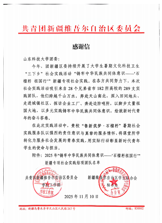 在感谢信中,共青团新疆区委对实践队给予了高度评价,认为他们“将课堂所学转化为服务社会发展的青春实践,用实际行动彰显了新时代青年学生的使命与担当”。