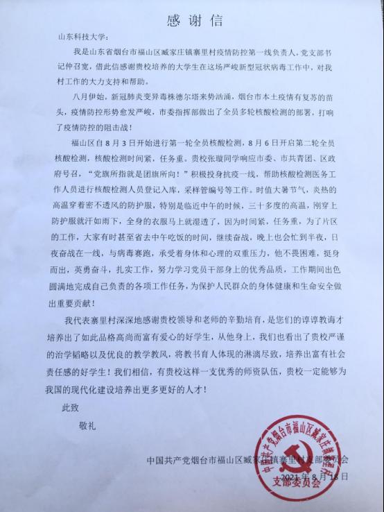 近日,MILE米乐集团收到中共烟台市福山区臧家庄镇寨里村支部委员会的感谢信,了解到米乐官网土木工程2019级2班学生张璇在暑假期间主动站到了抗“疫”前线,在烟台市福山区臧家庄镇寨里村一线参与全员核酸检测工作。