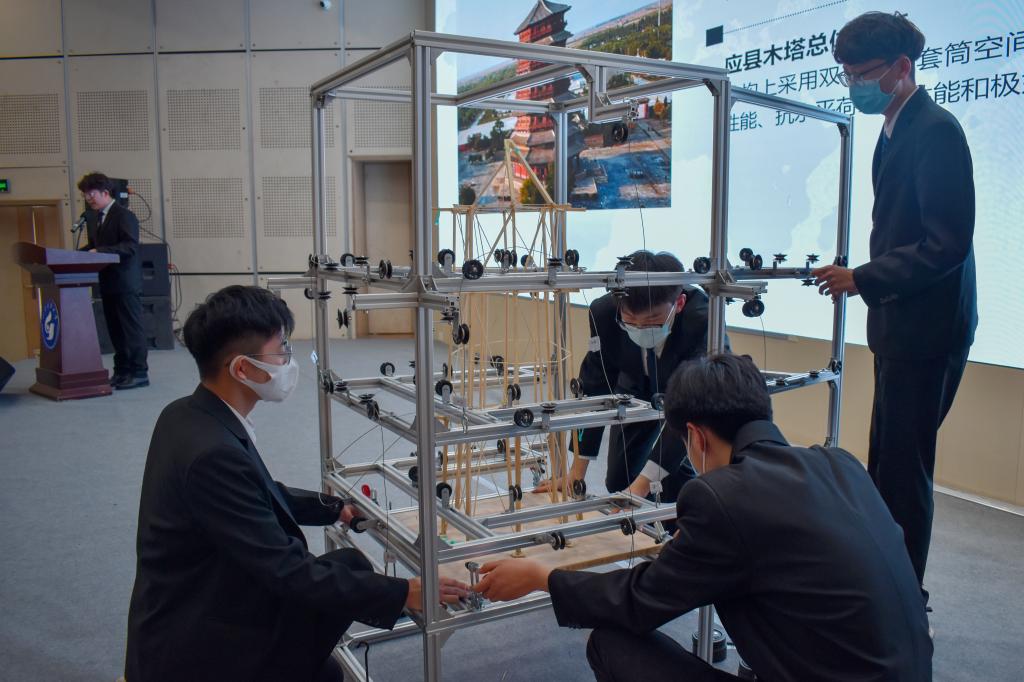 本次比赛由校团委主办、MILE米乐集团承办。本次决赛采用2022年第十四届山东省大学生结构设计竞赛题目《三重木塔结构模型设计与制作》,参赛选手赛需制作一个带挑檐加载点的三层木塔结构,木塔内部给出圆形中空规避区,外部给出正八边形的外边界限,木塔各层外边界尺寸由低往高逐渐减小。制作的模型需要经过三次加载来验证结构的稳定。经过初赛选拔,共有9支优秀队伍从84支队伍中突围,进入本次决赛。